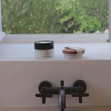 Step 1: Before showering, use the Dry Brush with gentle, upward strokes toward the heart to stimulate lymphatic flow and sweep away dull surface cells.